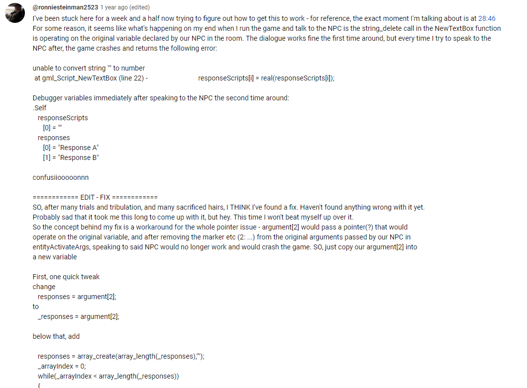 I’m now on Part 11 of Shaun Spaldings “Action RPG Tutorial” (Action RPG? You see why in the last blog post…). Shaun is a great expert at GameMaker and following their tutorial has been going great. Text boxes are working now. But as the video series is 3 years old, some of the code doesn’t work as expected when being copied over into newer versions of GameMaker. The only reason I am not ripping my hair out when running into problems is, that some people have done that (be)for(e) me. Thank God for Youtube Comments.